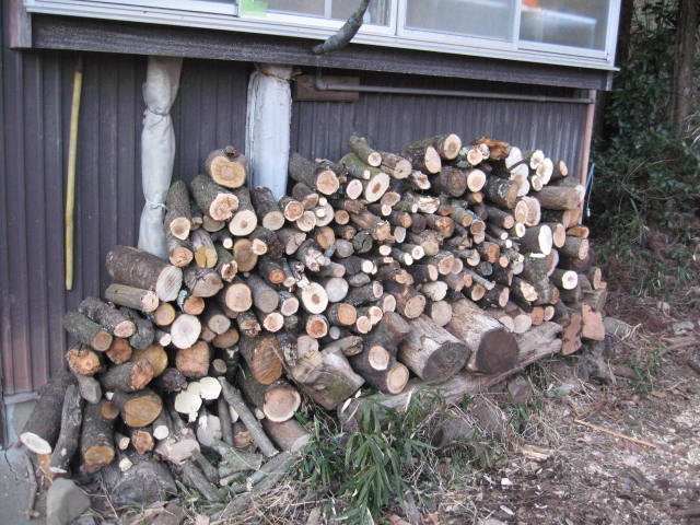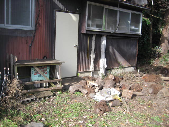 夜中に物音がすると思ったら、薪棚をイノシシに荒らされていました。